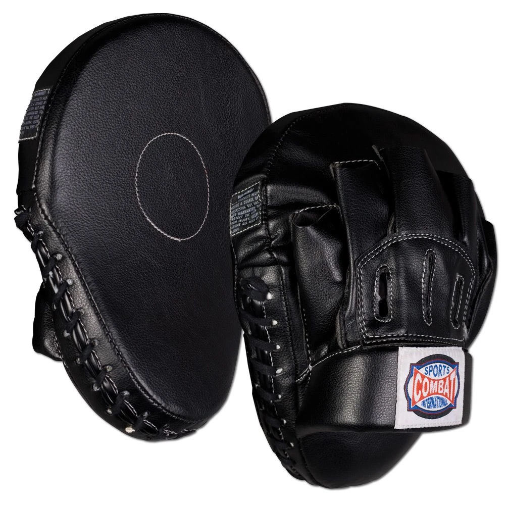 Curved punch mitt design from Combat Sports allows trainers’ hands to rest and absorb impact more comfortably.