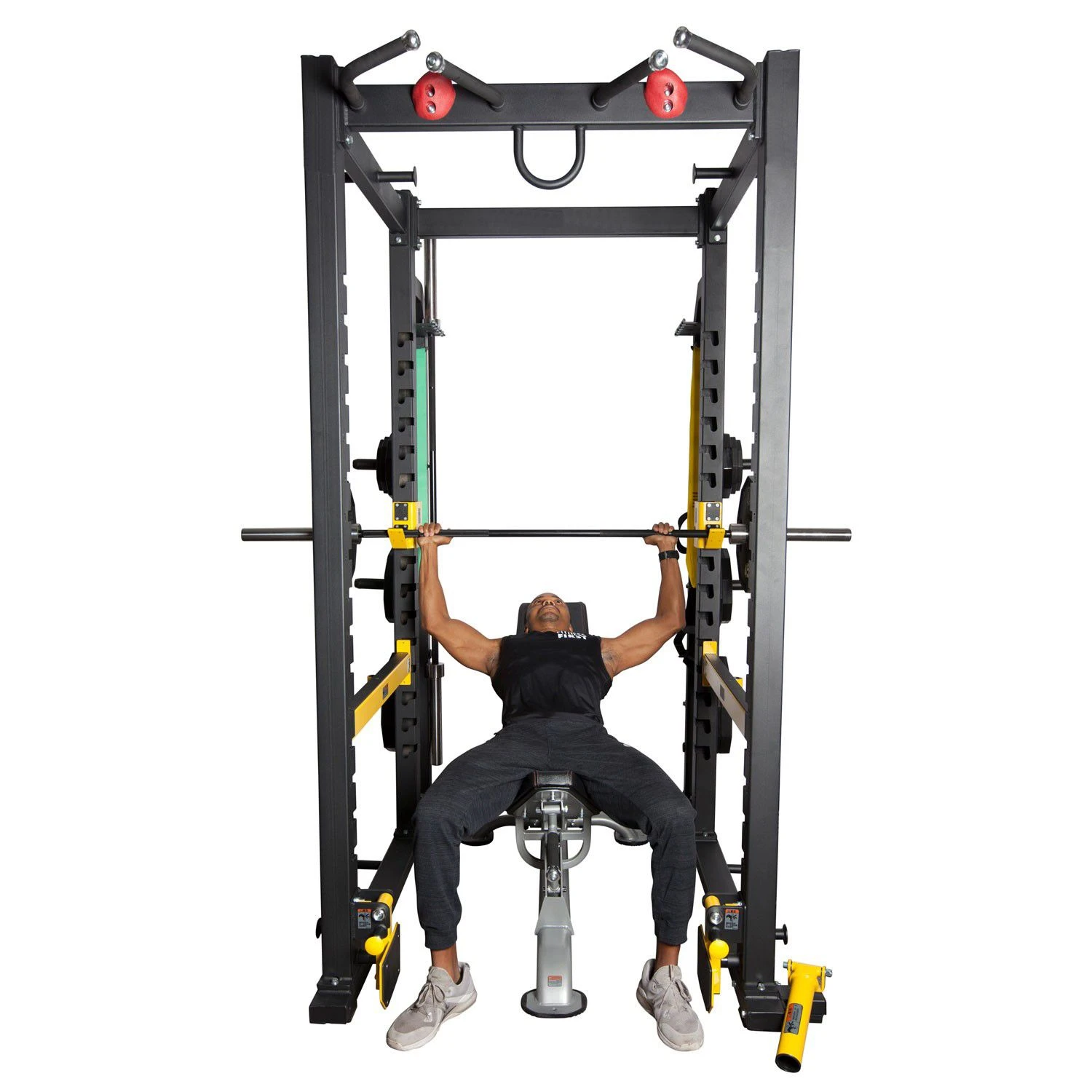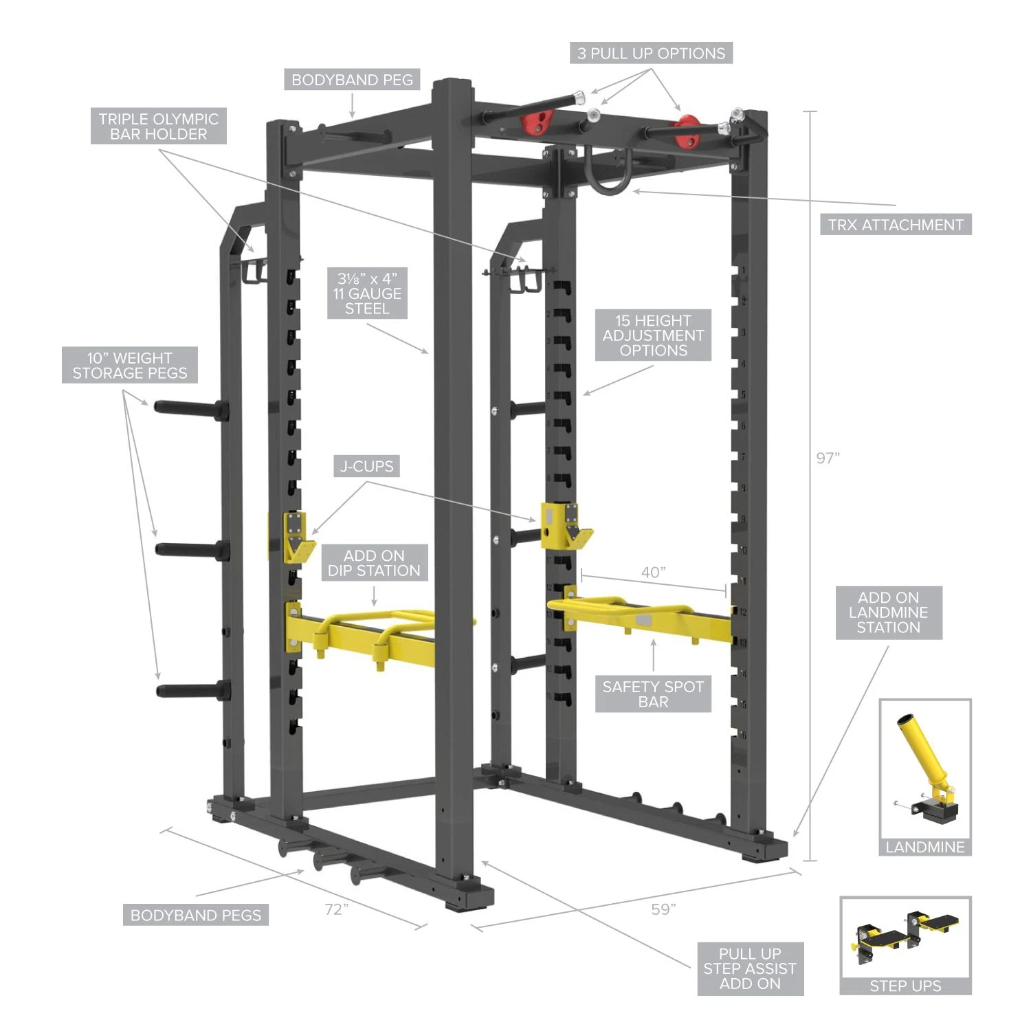 The Fitness First Power Rack is one of the most versatile and important pieces of equipment in any school, commercial, home or garage gym. It features a large walk-in area for easy access and maneuverability and supports seated, standing and lying free weight barbell exercises including bench press, squats, overhead press, rack pulls, rows, shrugs, and many more. The rack offers a total of 15 positions for bar support, helping it accommodate different heights and exercises. With multiple plate storage pegs and band holders. A sturdy solid steel construction design allows for longevity and use in any gym.