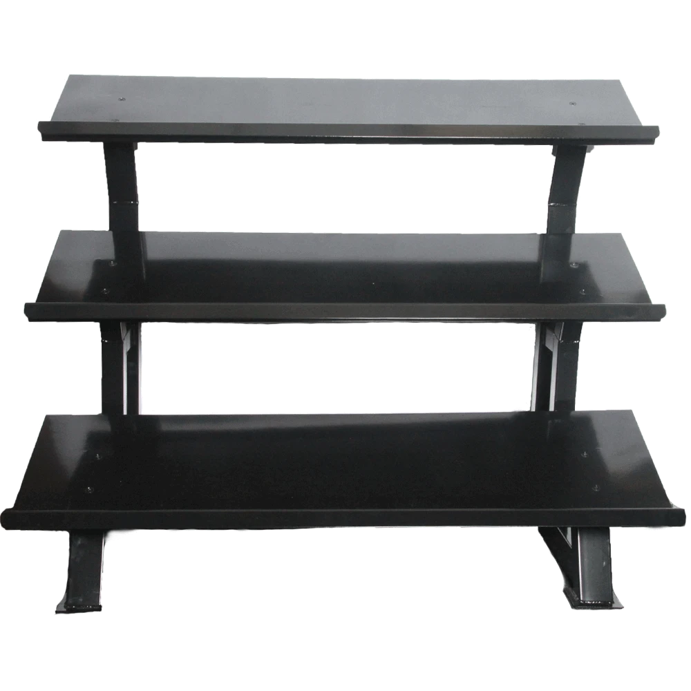 The Fitness First 3 Tier Commercial Horizontal Hex Dumbbell Rack is a great piece to add to any gym for your storage needs. This 3 tier storage system is made of solid 14-gauge steel design. It is designed to hold dumbbells, kettlebells or fitness balls. It is black in color and can hold 12 fitness balls, 9 sets of 50 plus pounds dumbbells or 12 sets of 30 pounds and under dumbbells.