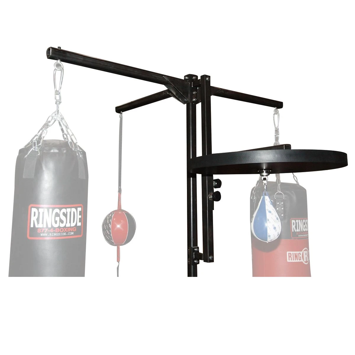 Get your complete workout done in one easy area with the new Ringside Professional 4-Station Stand that can utilize 2 types of heavy bags, speed bag platform and double ended speed bag area. This was made to take up smaller space area so more boxers can train in a smaller area. This is a must have for each gym. You can raise and lower the speed bag platform for ease of use. Solid steel construction and a sturdy base makes this easy to set up. While you can set it up yourself it is recommended for two people in assembly. Although the stand is extremely sturdy, we do not recommend utilizing the speed bag platform in conjunction with the heavy bag stations, due to the resulting vibration that may disrupt the rebound of the speed bag.