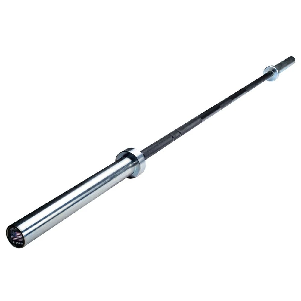 Solid Bar Fitness black oxide bar with a silver zinc sleeve finish and medium knurl is 6.5 ft long and weighs 33 pounds. This bar fits with all racks and benches and because of the 25mm shaft, it allows for a better grip for women and beginner lifters.