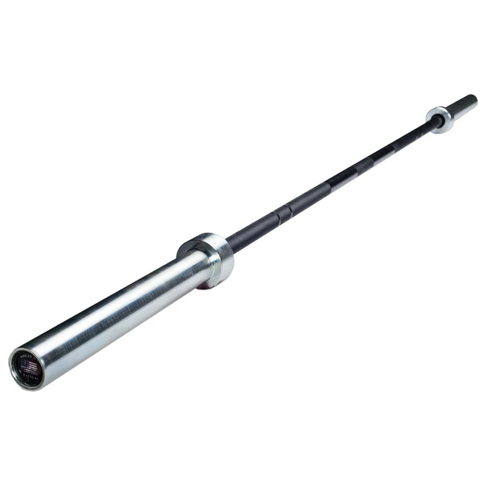 The Solid Bar Fitness Super Elite bar has special high strength stress proof alloy steel that is a black zinc bar with silver zinc sleeves. It CAN handle all of your toughest workouts at a 185,000 PSI. Also, it has double rings and oil impregnated bushings with medium-high center knurling.