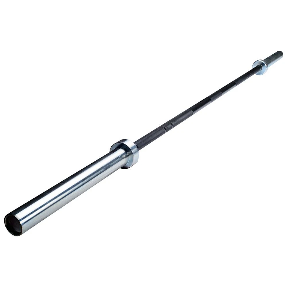 This bar is high strength stress proof alloy steel that is black oxide with zinc sleeves. It’s equipped with double rings and medium knurling. It is a 1800lb test bar which is great for on the platform or in the rack.