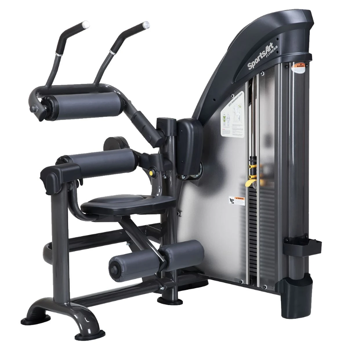 Specific product for working out the abdominal muscles and hip flexors. The exercise is performed from a sitting position, with the back and legs firmly positioned against the support pads. It involves flexing the trunk forward so that the shoulders are brought closer to the knees. Resistance is provided by a weight stack which enables the workload to be adjusted to suit each type of user.
