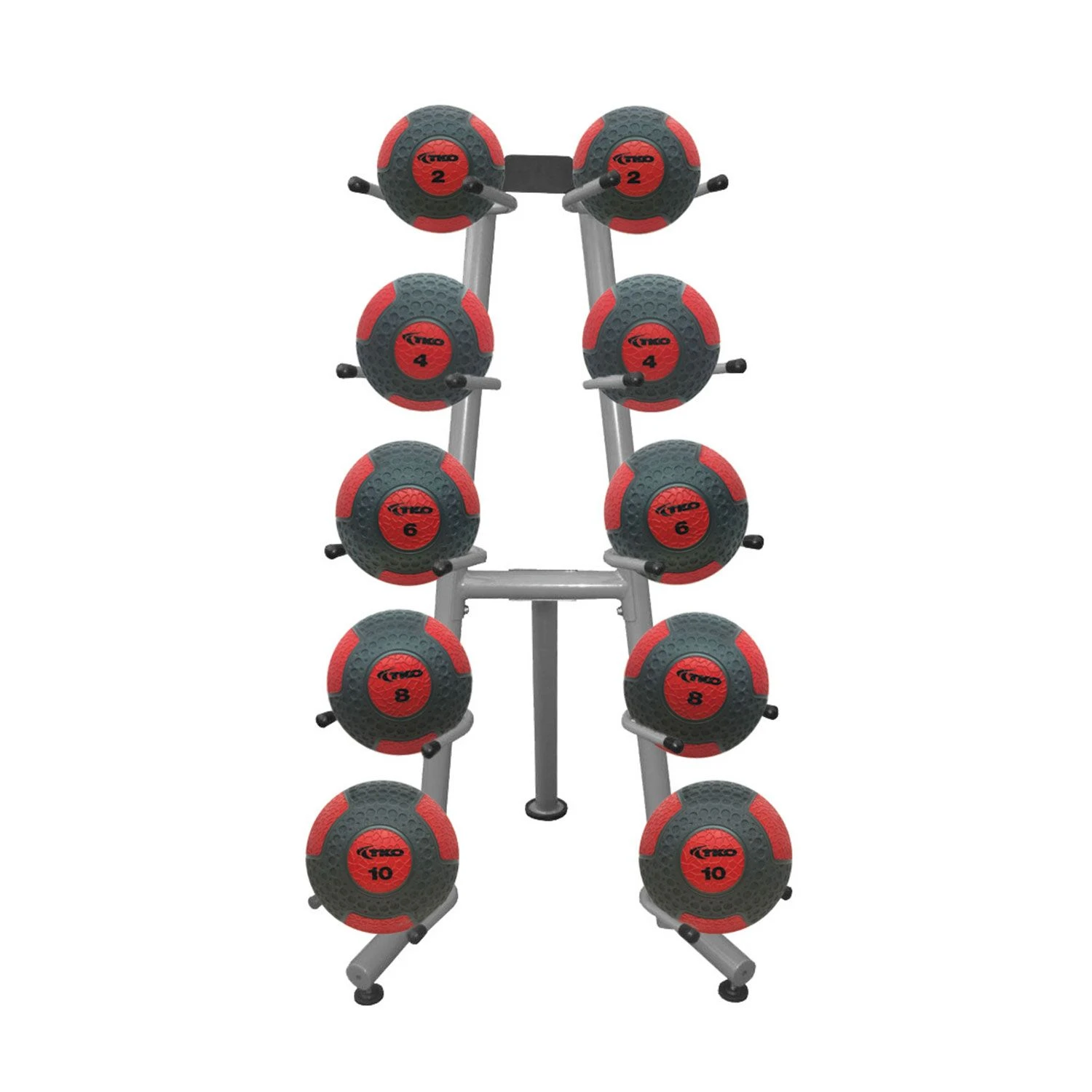 TKO”s Commercial Med Ball Rack holds up to 10 medicine balls. Its corner design allows for a smaller footprint and its over-sized round tubing is specifically designed for commercial applications.