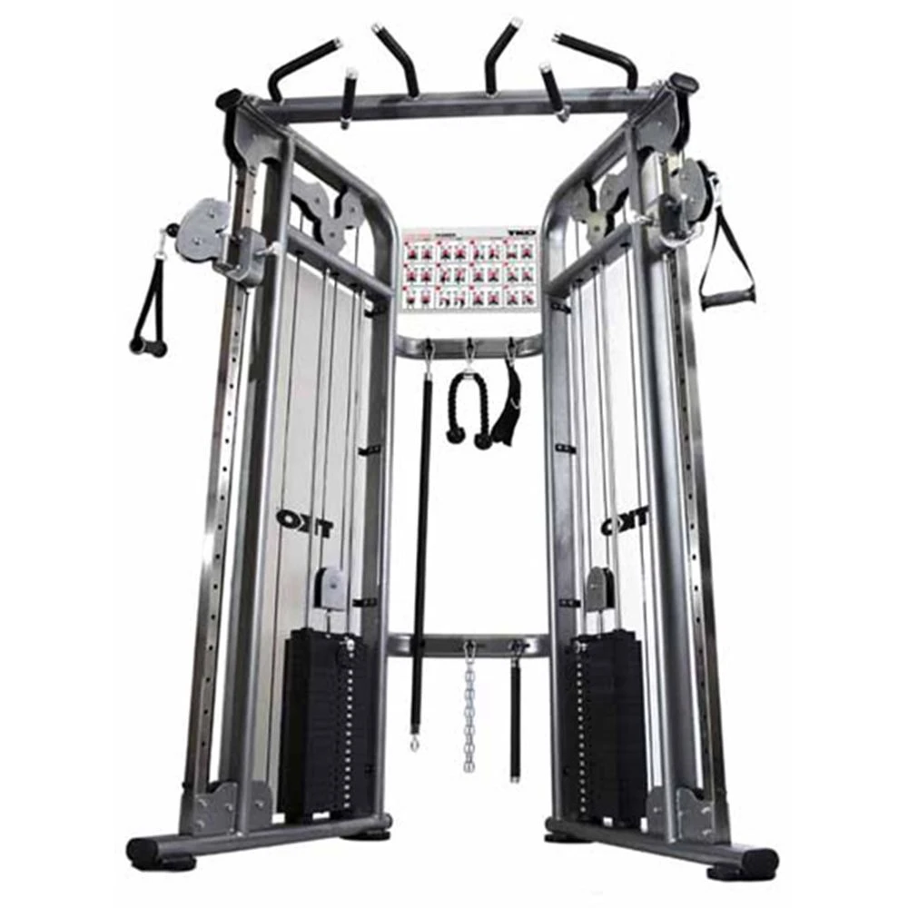 TKO”s Functional Trainer is made for all your gym needs. With a multi-grip handles, heavy gauge metal pulleys. Staineless steel 2” square tube uprights, 2 sided 210lbs weight stacks. The Functional Trainer also includes an essential accessory package : 1 long bar, 1 short bar, 1 deluxe tricep rope, 1 neoprene ankle strap, 2 molded grip handles and chains.