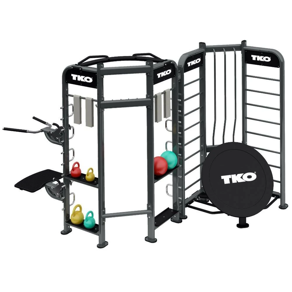 Want to have a lot of fitness opportunities in a smaller space. Take a big space and move it into a smaller one with the TKO Group Fitness Station. Great for use by either individuals or for group classes with activities such as: Stretching and Rebounder Station. High and low Monkey Bars, Dip and Step attachment and much more. Kettlebells, med balls, heavy bags and strength bands are sold separately.