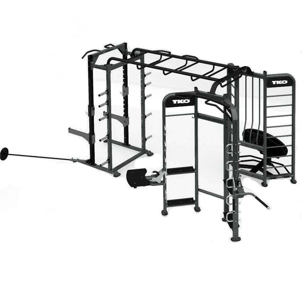 Want to have a lot of fitness opportunities in a smaller space. Take a big space and move it into a smaller one with the TKO Group Fitness Station. Great for use by either individuals or for group classes with activities such as: Stretching, Rebounder and Power Rack Station,. High and low Monkey Bars, Dip and Step attachment and much more. Kettlebells, med balls, heavy bags and strength bands are sold separately.